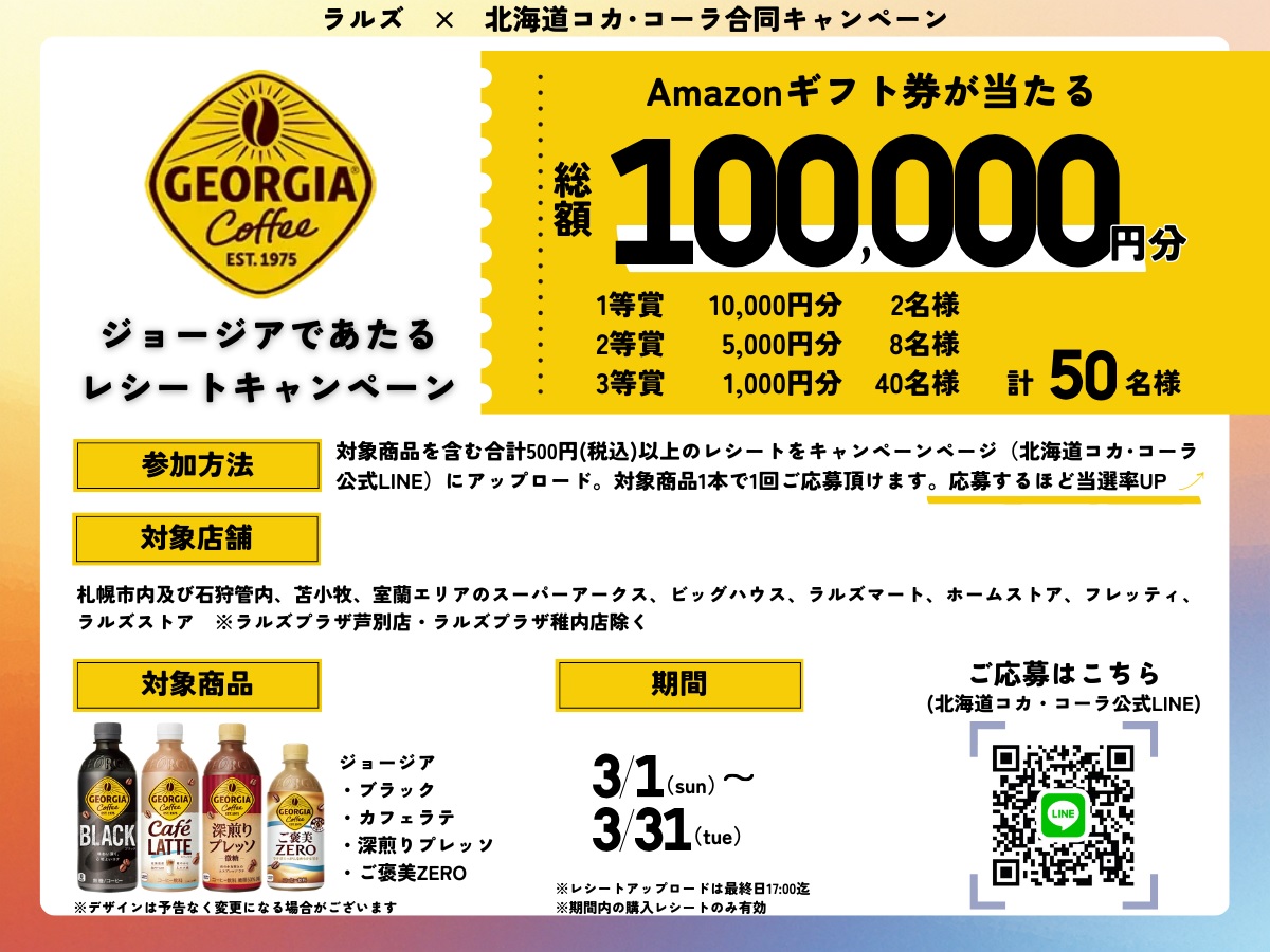 キャンペーン期間中、ラルズ各店で対象商品を含む合計500円以上(税込)のレシートをキャンペーンページ(北海道コカ・コーラ公式LINE)にアップロード。