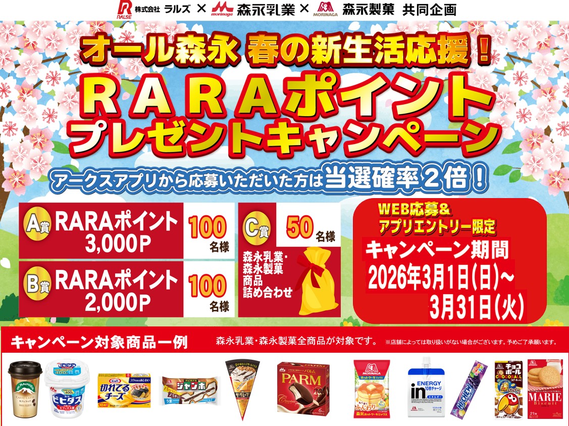 キャンペーン期間中、ラルズ各店で対象商品500円(税抜)以上を含むレシートをWEB応募フォームにてご応募下さい。