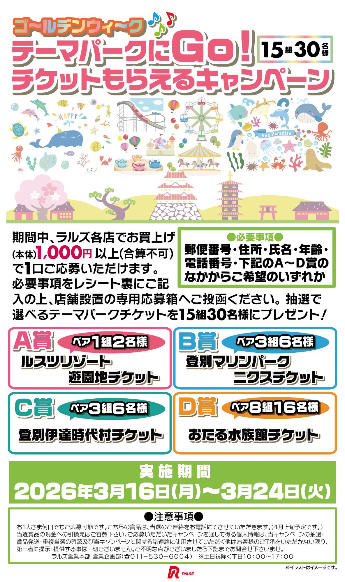 A賞:ルスツリゾート遊園地チケット ペア1組(2名様)