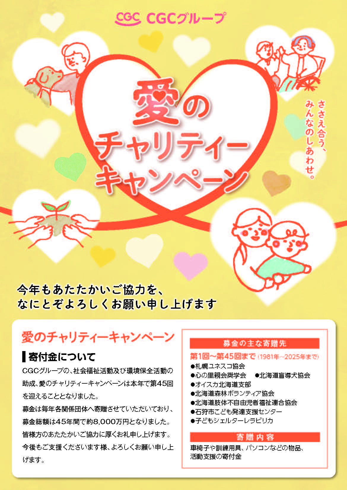 募金は毎年各関係団体へ寄贈させていただいており、北海道CGCグループでの募金総額は45年間で約8,000万円に達しております。