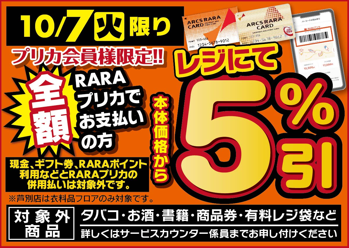 10月7日(火)限り!全額RARAプリカでお支払いの方、レジにて本体価格から5%引!(現金、ギフト券などとRARAプリカ・ポイント払いの併用払いは対象外です。また、たばこ、お酒、書籍、商品券などは割引対象外です。)