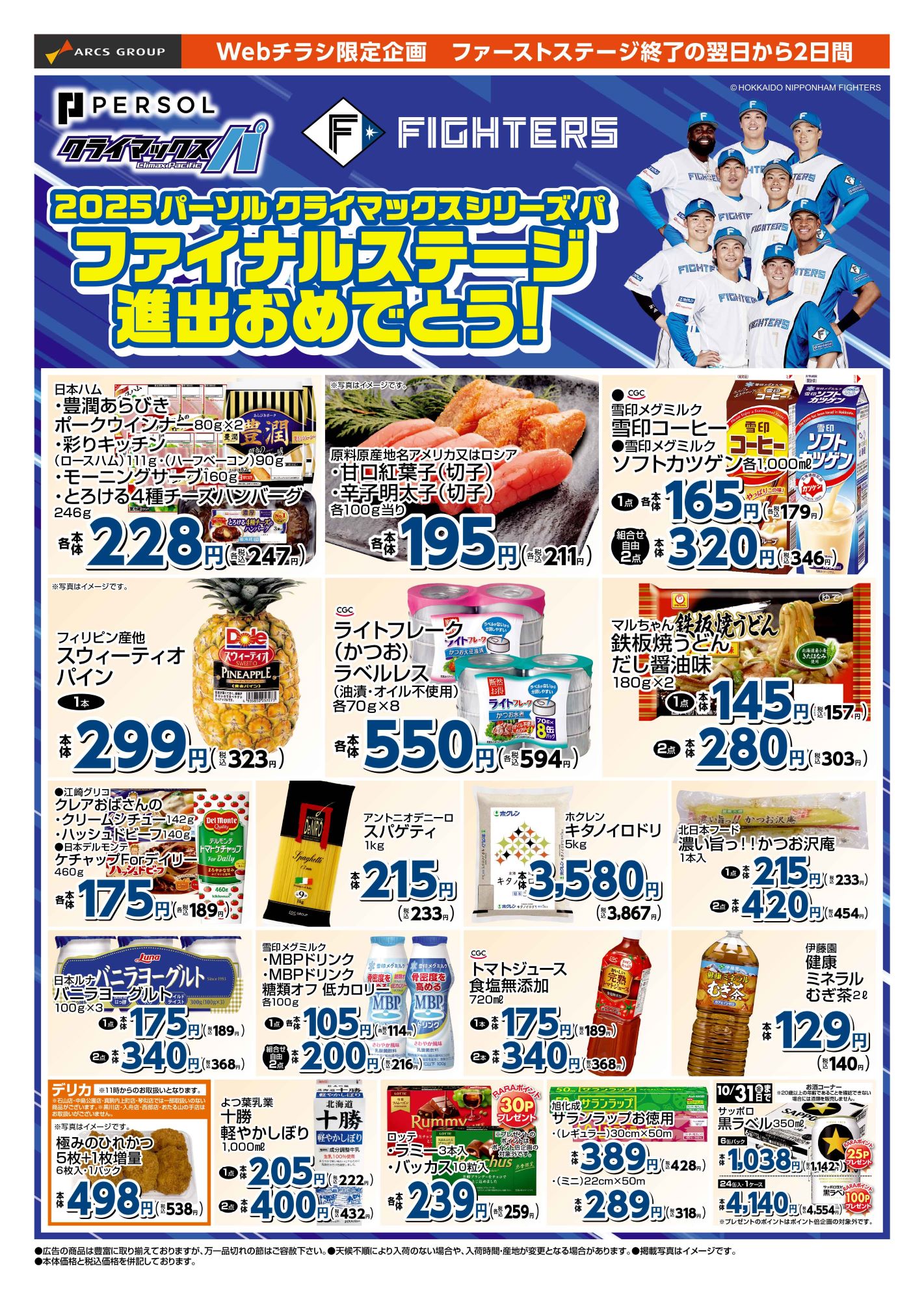 ラルズ 食品72店舗では 【北海道日本ハムファイターズ 2025パーソルクライマックスシリーズ パ ファイナルステージ進出おめでとう】セールを2025年10月13日・14日の2日間 実施いたします。ぜひご利用くださいませ。