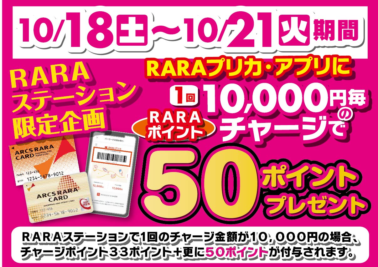 10月18日(土)~10月21(火)RARAステーションで、1回のチャージ金額が10,000円の場合、チャージポイント33ポイント+更に50ポイントが付与されます。※レジでのチャージはポイントプレゼント対象外です。