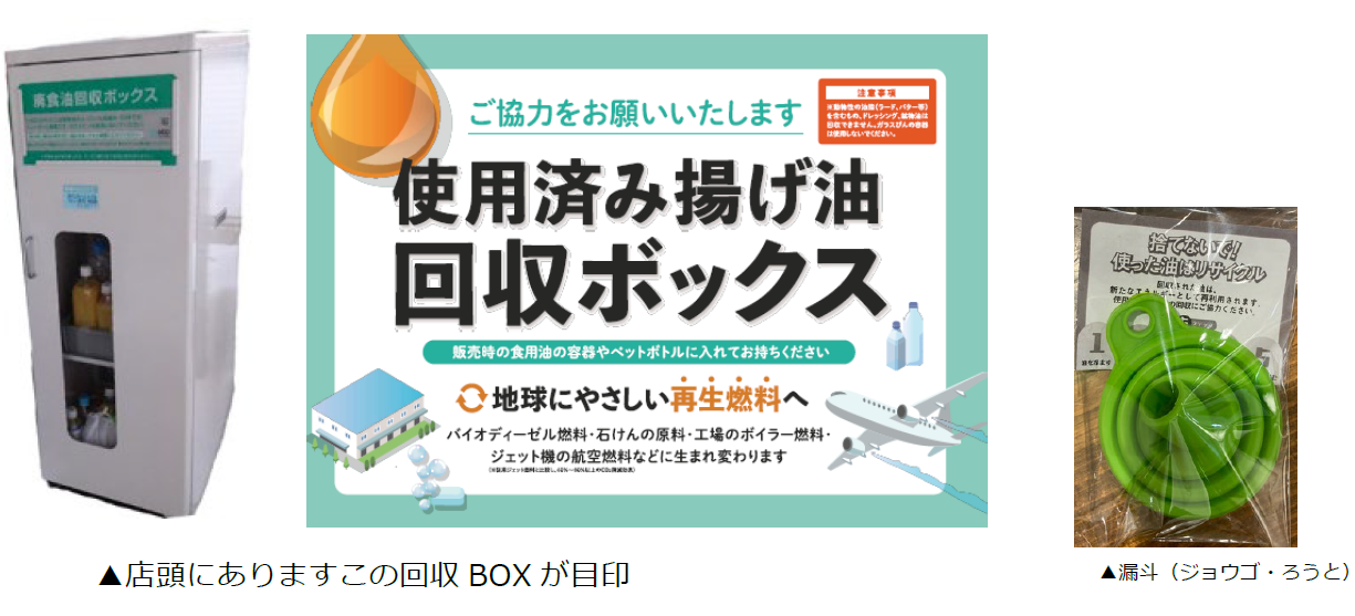 一方、国内の家庭系廃食油のリサイクル率はわずか4%にとどまり、約96%が未回収のまま廃棄されているという課題があります。この課題解決に向け、3者は連携し、10月20日の「リサイクルの日」より、下記該当店舗の店頭で食用油をお買い上げいただいたお客様に漏斗(ジョウゴ・ろうと)をプレゼントして、課題となっておりました回収量の増加を目指して参ります。
