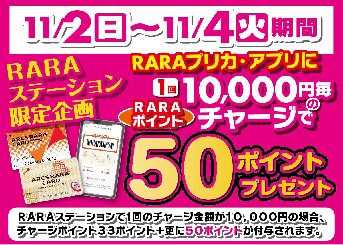 11月2日(日)~11月4日(火)RARAステーションで、1回のチャージ金額が10,000円の場合、チャージポイント33ポイント+更に50ポイントが付与されます。※レジでのチャージはポイントプレゼント対象外です。