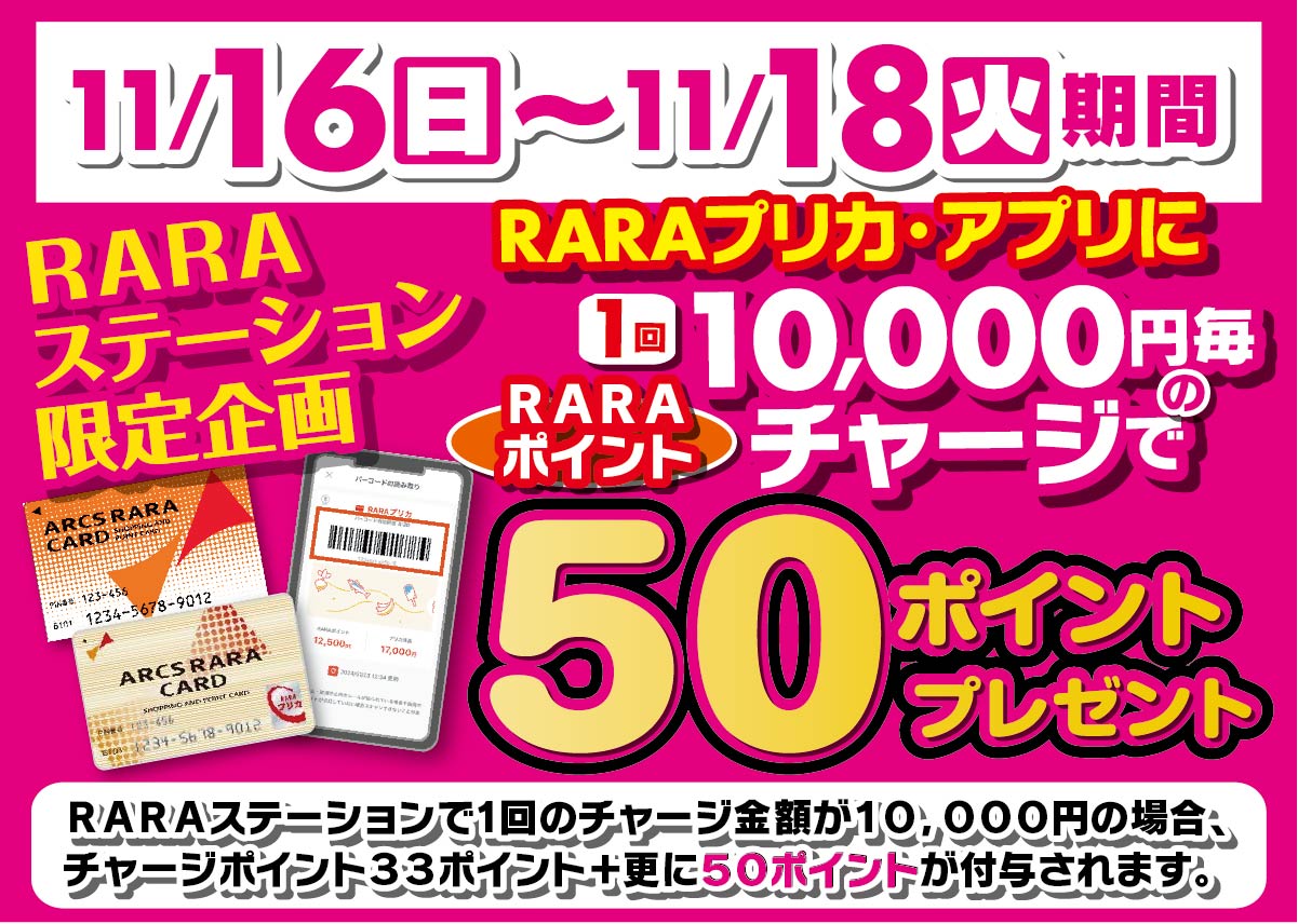 11月16日(日)~11月18日(火)RARAステーションで、1回のチャージ金額が10,000円の場合、チャージポイント33ポイント+更に50ポイントが付与されます。※レジでのチャージはポイントプレゼント対象外です。