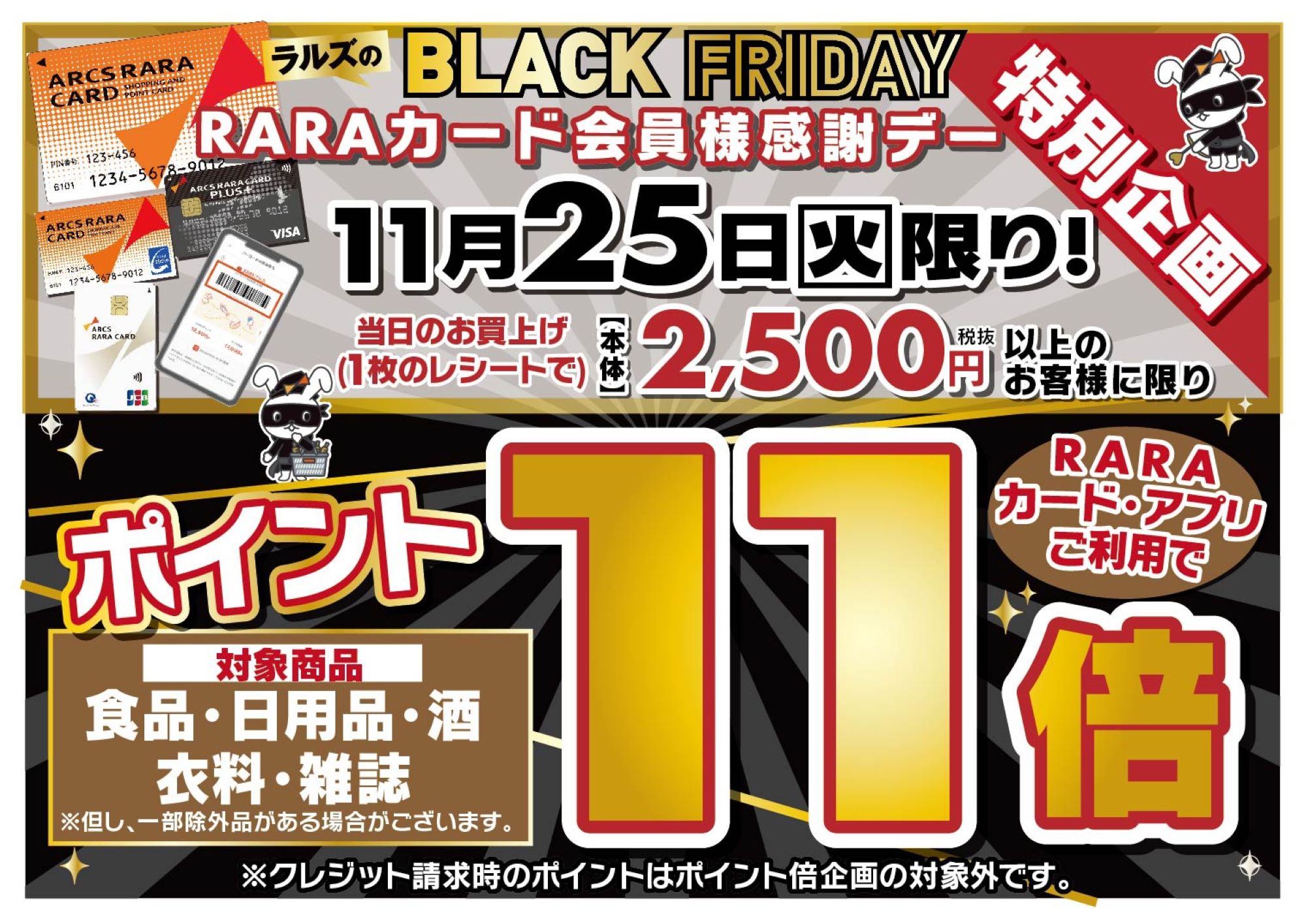 ラルズのBLACK FRIDAY 特別企画 RARAカード会員様感謝デー11月25日(火)限り ポイント11倍!(当日のお買上げ 1枚のレシートで本体 2,500円以上のお客様に限り)※対象商品:食品、日用品、酒、衣料、雑誌(ただし、一部除外品がある場合がございます。)