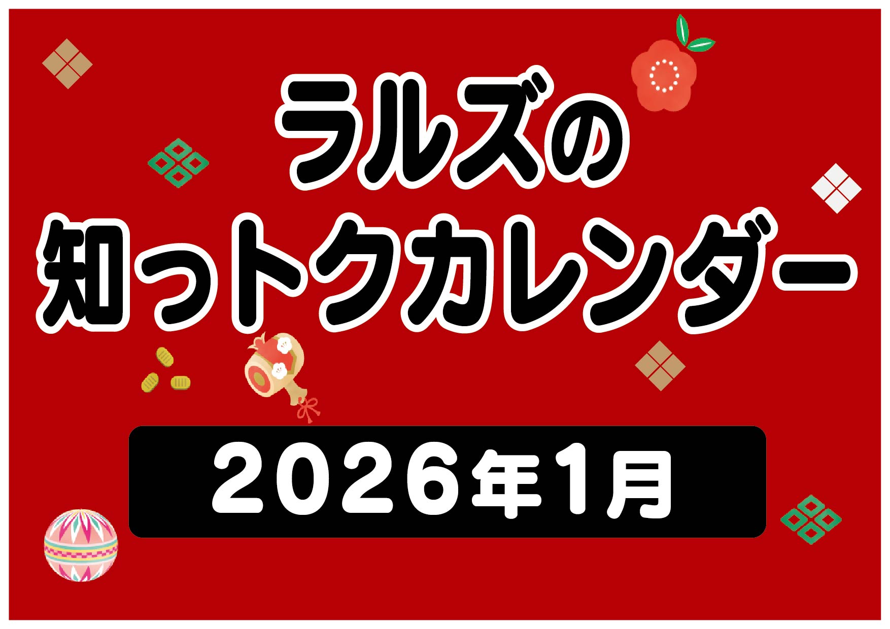 2026年1月の知っトクカレンダーを掲載いたしました。店舗により企画内容・日程が異なります。ご確認の上ご来店ください。 ※札幌・恵庭・千歳・北広島・石狩・江別・苫小牧・岩見沢の店舗および桂岡店はこちら※小樽(桂岡店除く)・余市の店舗はこちら※室蘭・登別・伊達の店舗はこちら