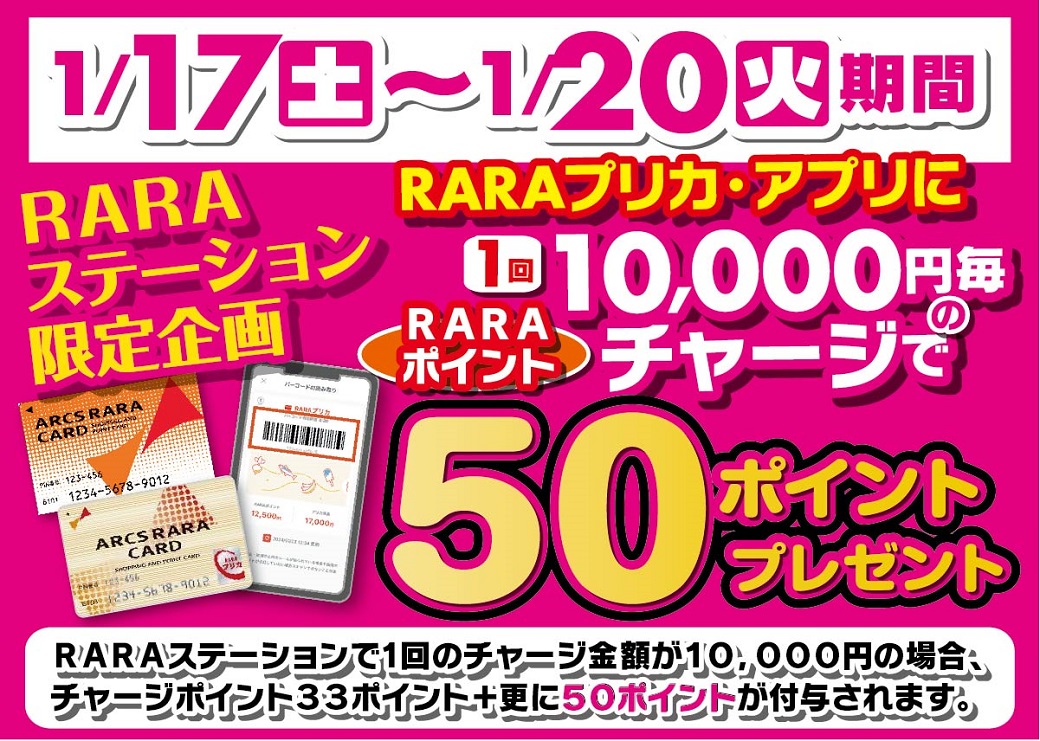 1月17日(土)~1月20日(火)RARAステーションで、1回のチャージ金額が10,000円の場合、チャージポイント33ポイント+更に50ポイントが付与されます。※レジでのチャージはポイントプレゼント対象外です。
