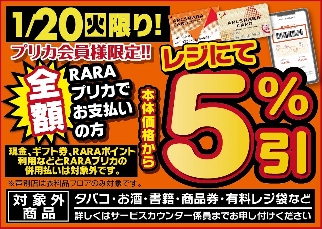 1月20日(火)限り!全額RARAプリカでお支払いの方、レジにて本体価格から5%引!(現金、ギフト券などとRARAプリカ・ポイント払いの併用払いは対象外です。また、たばこ、お酒、書籍、商品券などは割引対象外です。)