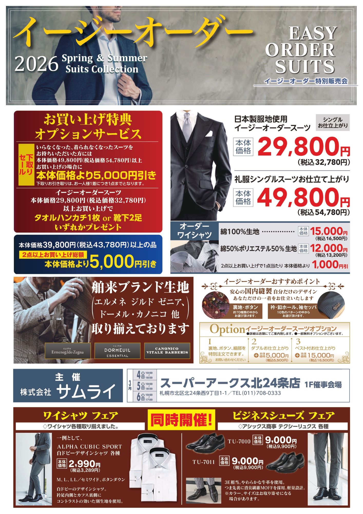 【2026 Spring&Summer Suits Collection】 イージーオーダー特別展示会 (主催 株式会社サムライ)※同時開催 春のワイシャツフェア・ビジネスシューズフェア 2026年3月4日(水)・5日(木)10:00~18:00・ 6日(金)10:00~17:00 スーパーアークス北24条店 1階催事会場 札幌市北区北24条西9丁目1-1