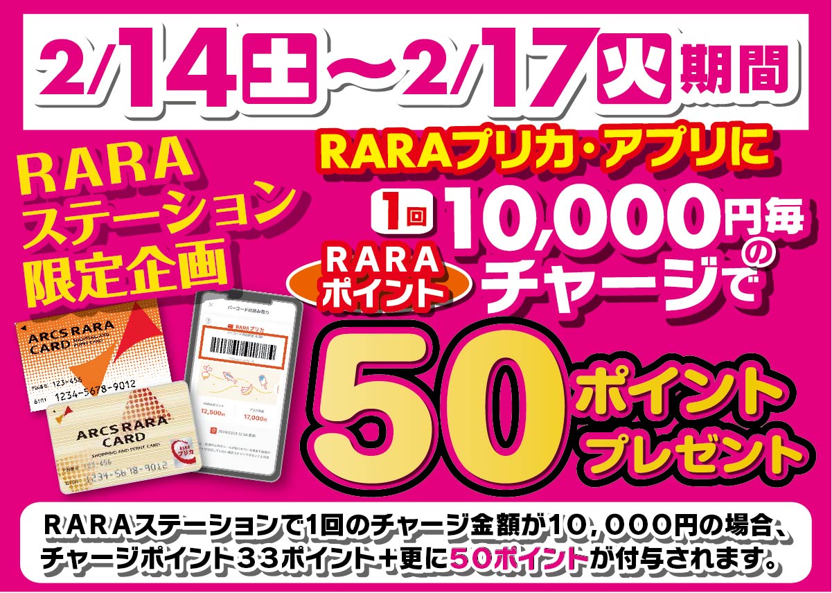 2月14日(土)~2月17日(火)RARAステーションで、1回のチャージ金額が10,000円の場合、チャージポイント33ポイント+更に50ポイントが付与されます。※レジでのチャージはポイントプレゼント対象外です。