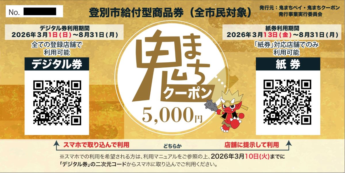 【登別デジタル商品券 鬼まちクーポン】2026年3月1日(日)~8月31日(月)【登別プレミアム付デジタル商品券 鬼まちペイ】2026年4月16日(木)~8月31日(月)登別市内のホームストア各店で使えます。(赤鬼ペイのみ)・ホームストア幌別店・ホームストア アーニス店※鬼まちクーポン・鬼まちペイのご利用方法はこちら