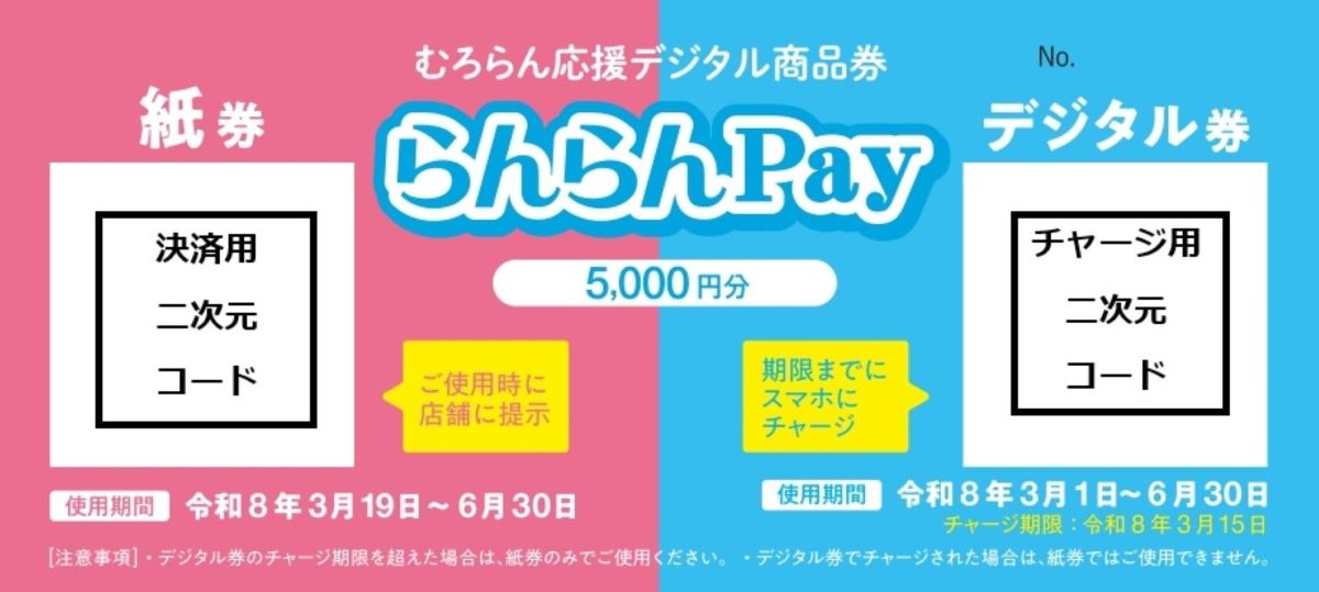【むろらん応援デジタル商品券『らんらんPay』2026】■デジタル券 3月1日(日)~6月30日(火)■紙券 3月19日(木)~6月30日(火)室蘭市内のラルズ各店で使えます。・ホームストア輪西店・ホームストア港北店・ホームストア新たかさご・スーパーアークス中島店・スーパーアークス室蘭中央