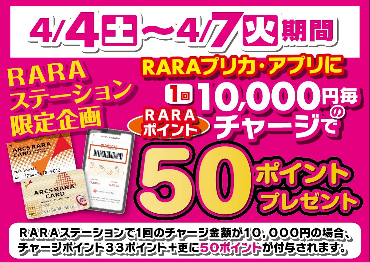 4月4日(土)~4月7日(火)RARAステーションで、1回のチャージ金額が10,000円の場合、チャージポイント33ポイント+更に50ポイントが付与されます。※レジでのチャージはポイントプレゼント対象外です。