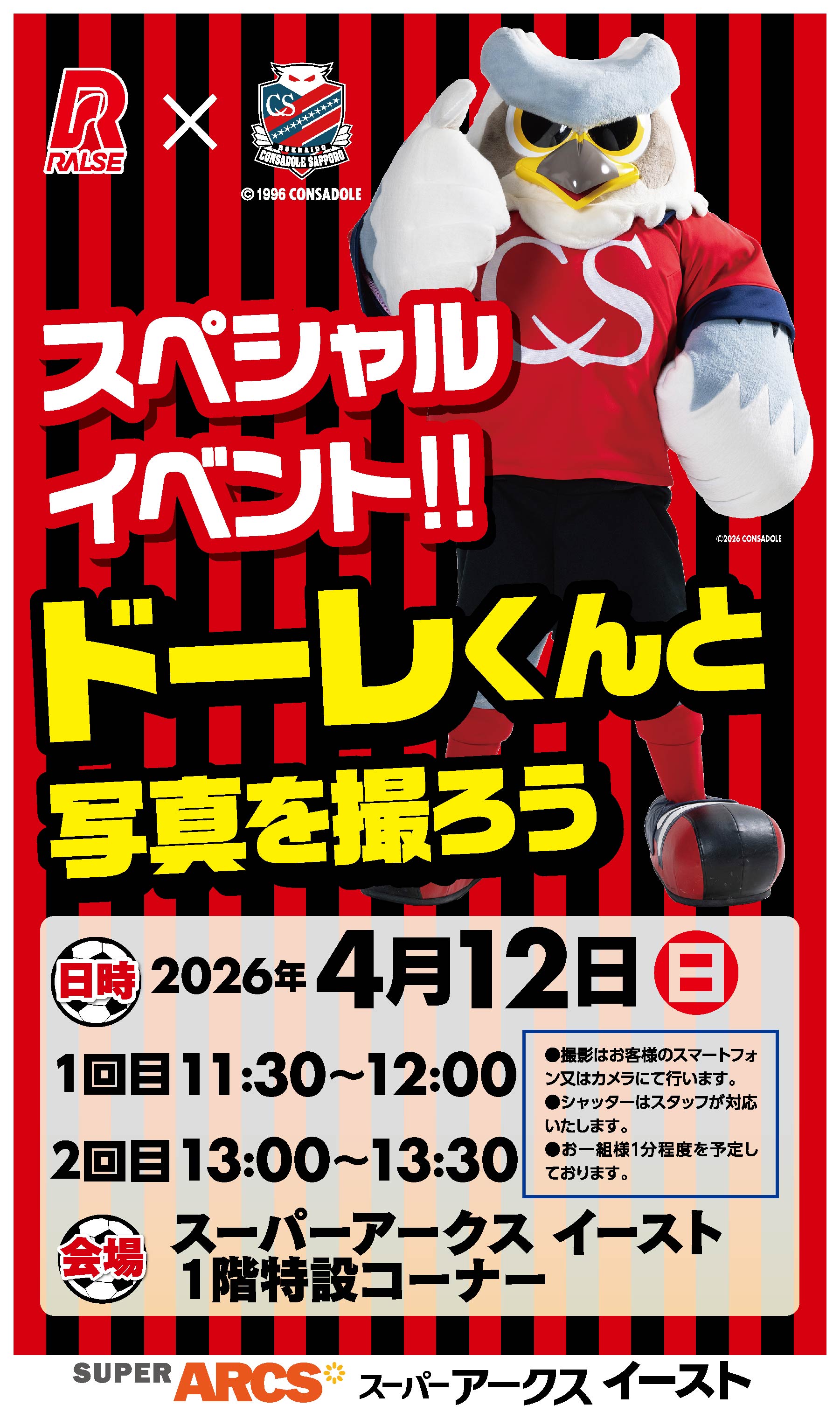 アークスグループは、北海道コンサドーレ札幌の2026シーズンクラブパートナーです。2026年4月12日(日)スーパーアークスイースト(札幌市厚別区厚別中央2条2丁目2-6)にて、マスコットキャラクターのドーレくんとハイタッチ&写真撮影ができるイベントを開催いたします。日付:2026年4月12日(日)時間:1回目 11:30~ 2回目 13:00~場所:1階特設コーナー