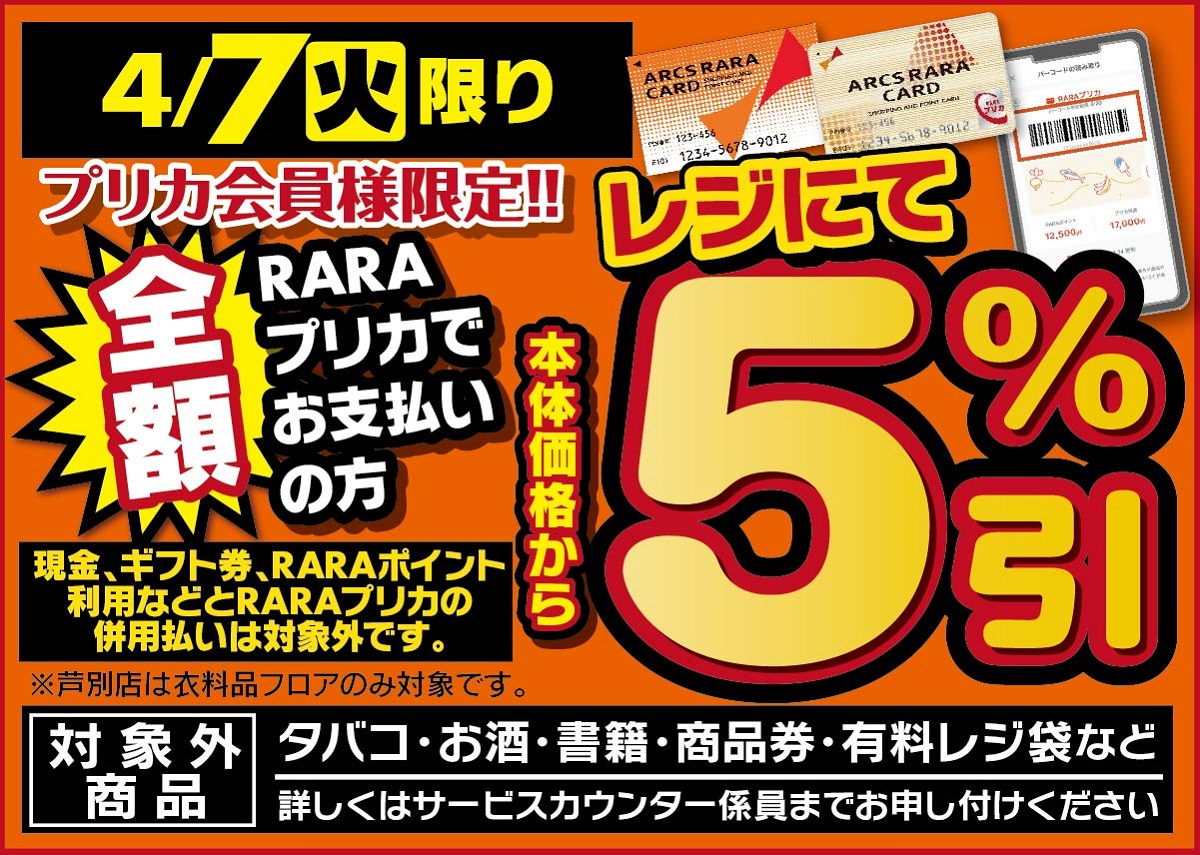 4月7日(火)限り!全額RARAプリカでお支払いの方、レジにて本体価格から5%引!(現金、ギフト券などとRARAプリカ・ポイント払いの併用払いは対象外です。また、たばこ、お酒、書籍、商品券などは割引対象外です。)