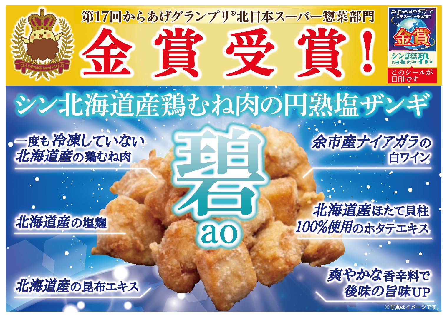 この度、日本で一番うまいから揚げを決める「第17回からあげグランプリ®」北日本スーパー総菜部門におきまして、ラルズの「シン北海道産鶏むね肉の円熟塩ザンギ 碧ao」が金賞を受賞しました。